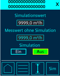 Darunter wird der aktuelle Messwert ohne Simulation angezeigt. Per Druck auf die Taste "Ein" wird der Simulationswert als aktueller Messwert
