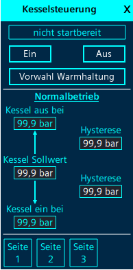 Das PopUp "Steuerung Dampfkessel" wird verwendet, um einen Dampfkessel zu steuern und die grundlegenden Parameter