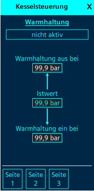 Im oberen Bereich des PopUps steht die Überschrift "Kesselsteuerung". Mit der Taste "X" kann das PopUp wieder geschlossen werden.