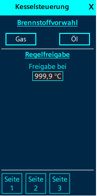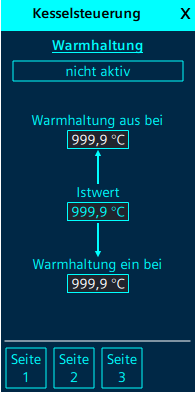Im oberen Bereich des PopUps steht die Überschrift "Kesselsteuerung". Mit der Taste "X" kann das PopUp wieder geschlossen werden.