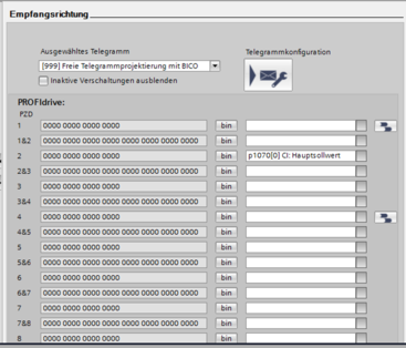 Konfiguration Freies Telegramm mit BICO 999 Empfangsrichtung
