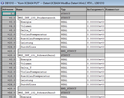 Im DB "PDB Daten für 0CBA04 WinLC" werden die Zählerwerte, zur Übergabe an das Step7-Programm im Microbox-PC in der 0CBA04, gesammelt. Sämtliche Zähler, die keine Drücke/Differenzdrücke sind, müssen aus dem zum Gateway zugehörigen „PDB Prozessdaten Modbus“ hier herein kopiert werden.