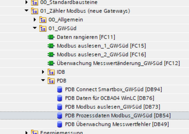 Damit die Werte der Zähler für das WinCC zur Verfügung stehen, müssen diese im TIA-Programm definiert werden. Hierzu wählt/erstellt man im TIA-Projekt unter CPU 0CBA04->Programmbausteine->01_Zähler Modbus (neue Gateways)->0x_GW-x die entsprechenden Datenbausteine und Programmteile.