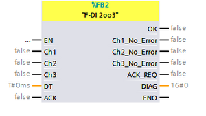 Sind zwei oder alle Eingänge FALSE (Ch1... Ch3), wird das Fehlersignal „OK“ FALSE. Sobald mindestens zwei Eingange den Gutzustand erreichen (TRUE) lässt sich der Baustein über den Eingang „ACK“ quittieren. Damit ein kurzes Flackern am Eingang, nicht den Signalstatus des Ausganges beeinflusst, kann am Eingang „DT“ eine Überwachungszeit eingestellt werden. Erst wenn ein Eingang länger als die eingestellte Zeit FALSE ist, kommt es zu einer Reaktion.