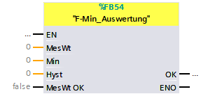 ist die Hysterese zum minimalen Grenzwert, bei dem der Ausgang „OK“ wieder auf „TRUE“ geschaltet wird, wenn der Eingang „MesWt“ den Wert „Min+Hyst“ überschreitet.