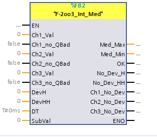 Dieser Funktionsbaustein selektiert im störungsfreien Fall aus den drei Analogwerten (Ch1_Val... Ch3_Val) den mittleren Wert und gibt diesen an die Ausgänge „Med_Min“ und „Med_Max“ aus.