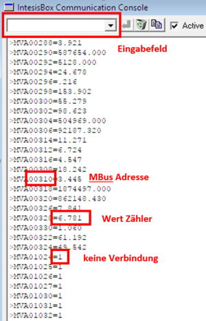 Jetzt muss man oben im Fenster "IntesisBox Communication Console" im Eingabefeld "Debug = 1" eingeben und mit Enter bestätigen. Dann kann man über den Button „MBus“ unter der jeweiligen Device-Nr die Reihenfolge der Zählwerte des Geräts auslesen. Anhand dieser Reihenfolge können die Register im Konfigurationsfenster (Button "Config") unter „Signals“ vervollständigt werden. Auch hier muss noch einmal gespeichert und die Intesis-File übertragen werden.