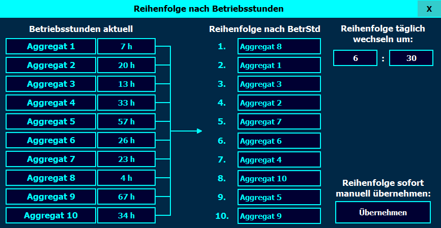 Zeigt das Bedienfenster der Reihenfolge nach Betriebsstunden von FB_Folgeschaltung_10.