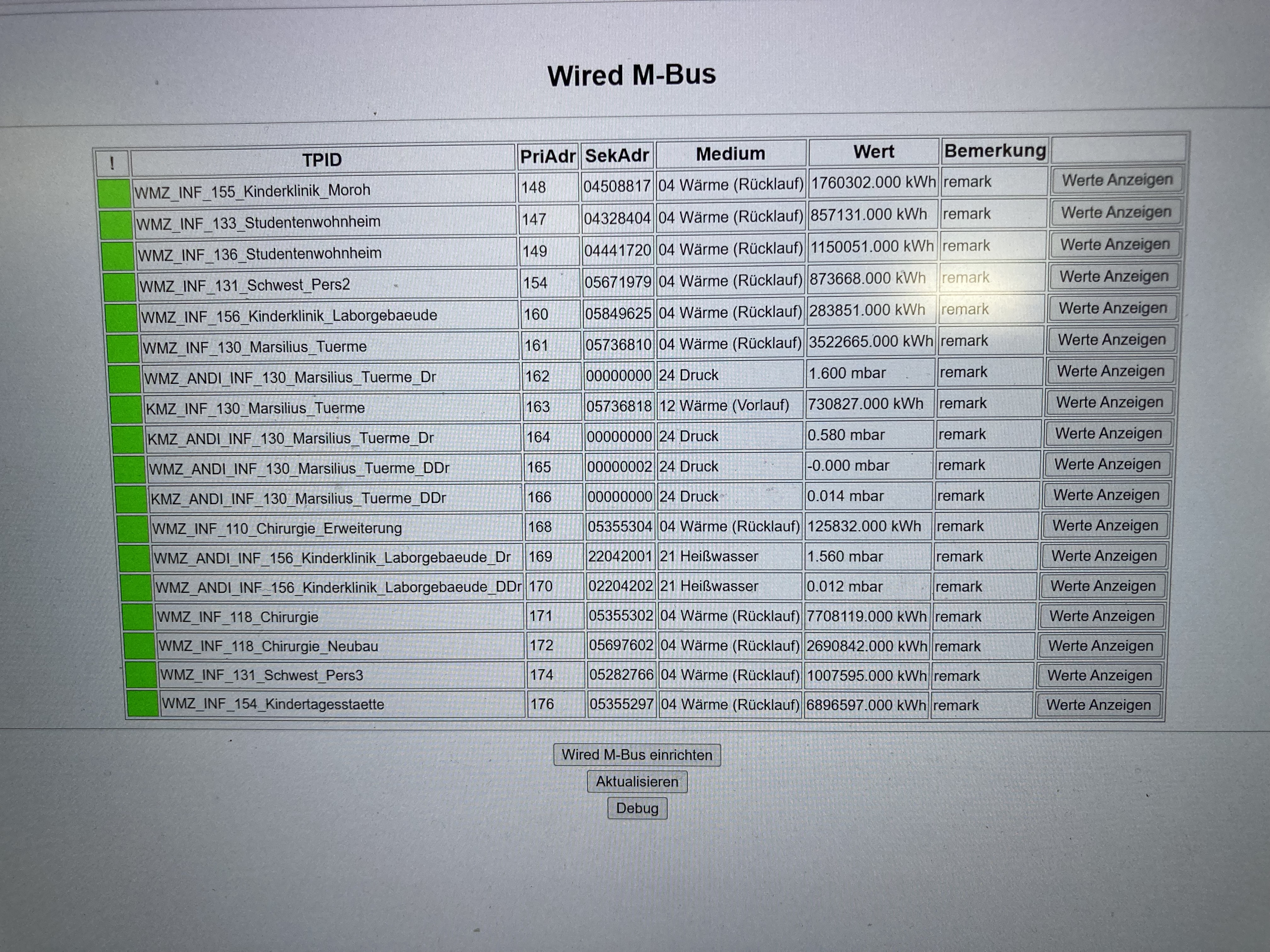 Tabelle der Zähler mit aktuellem Status