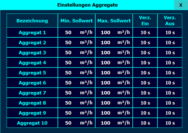 Hier können pro Aggregat folgende Werte vorgegeben werden: