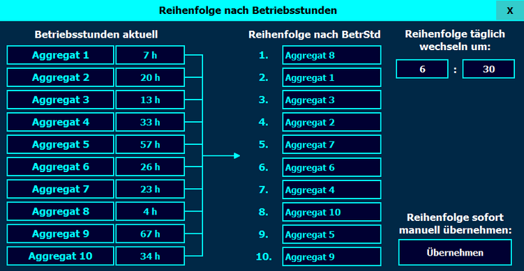 Ist der Modus 1 (Reihenfolge nach Betriebsstunden) angewählt, so öffnet die Taste "Reihenfolge" auf dem Grundbild das folgende Bedienfenster: