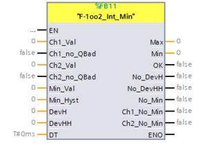 Dieser Funktionsbaustein selektiert im störungsfreien Fall aus den zwei Analogwerten (Ch1_Val... Ch2_Val) den minimalen und maximalen Wert und gibt diese an die Ausgänge „Min“ und „Max“ aus.
