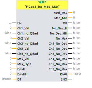 Dieser Funktionsbaustein selektiert im störungsfreien Fall aus den drei Analogwerten (Ch1_Val... Ch3_Val) den minimalen und maximalen Wert und gibt diese an die Ausgänge „Med_Min“ und „Med_Max“ aus.