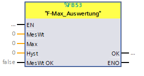 ist die Hysterese zum maximalen Grenzwert, bei dem der Ausgang „OK“ wieder auf „TRUE“ geschaltet wird, wenn der Eingang „MesWt“ den Wert „Max-Hyst“ unterschreitet.