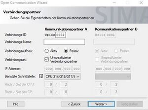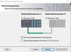 Falls man die Kommunikation zwischen zwei 300er bzw. 400er aufbauen will, kann man beide Kommunikationspartner projektieren. Falls die Remote-CPU eine 1500er in einem TIA-Projekt ist, sollte "Nur Kommunikationspartner A projektieren" ausgewählt werden.