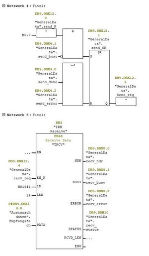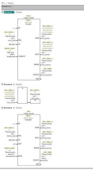 FC mit folgender Struktur (Beispielhaft)FC (NW 1-3)FC (NW4-5)Am Parameter "CONNECT" des "TCON" wird per Pointer auf den "UDT65", der die Verbindungsinformationen enthält, verwiesen.