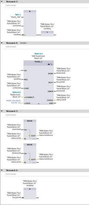 Erstellung eines FC's, in dem TSEND_C und TRCV_C aufgerufen werden. Die Variablen, die in dem vorherigen PDB angelegt wurden, können wie in den Beispielbildern (unten) verwendet werden.